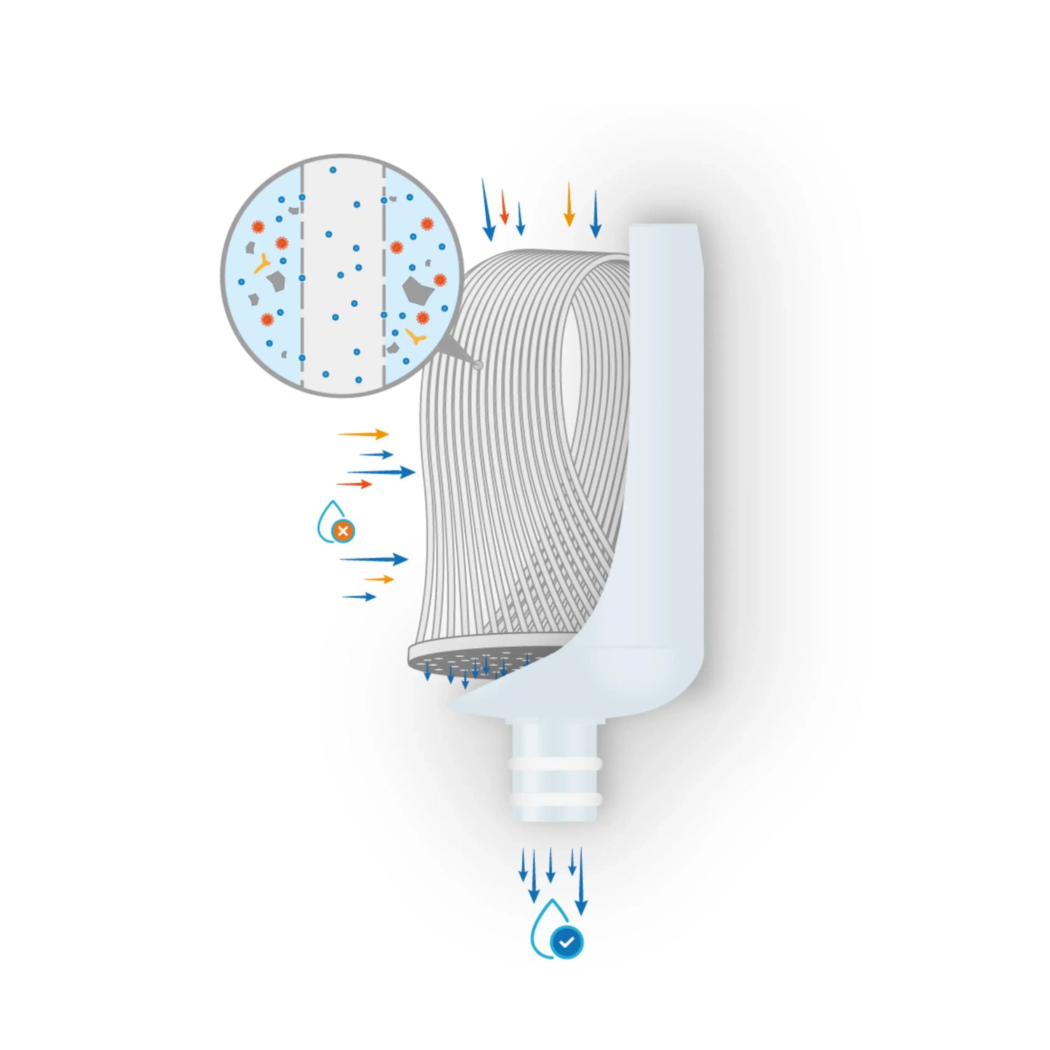 Das Wasser wird gefiltert, bevor es auf die Haut trifft, was insbesondere bei empfindlicher Haut oder Allergien von Vorteil ist. Zusätzlich werden unangenehme Gerüche und Chlor aus dem Wasser entfernt, während wichtige Mineralien erhalten bleiben.